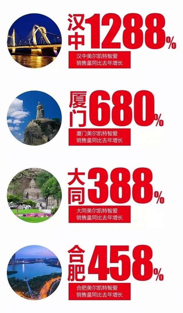 放眼全國,美爾凱特各專賣店智愛暖空調(diào)的銷售增長量均在100%以上,截至2016年10月底,從美爾凱特各專賣店統(tǒng)計就足以說明消費者對智愛暖空調(diào)的青睞。漢中美爾凱特智愛銷售量比去年增長1288%,廈門美爾凱特智愛暖空調(diào)銷售增長680%,大同美爾凱特智愛暖空調(diào)銷售增長388%,合肥美爾凱特智愛暖空調(diào)銷售增長458%。